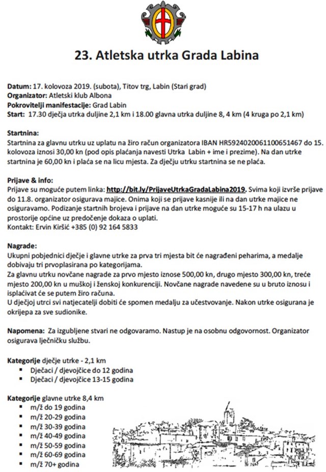 Utrka s velikom tradicijom, „Atletska utrka Grada Labina“ ovog se vikenda, točnije u subotu 17. kolovoza, po 23. put održava u tom gradu. Organizator je AK Albona, a pokrovitelj manifestacije Grad Labin. Sve započinje u 17:30 kad je na rasporedu dječja utrka duljine 2,1 kilometara da bi u 18 na startu bili sudionici glavne utrke duljine 8,4 kilometara.