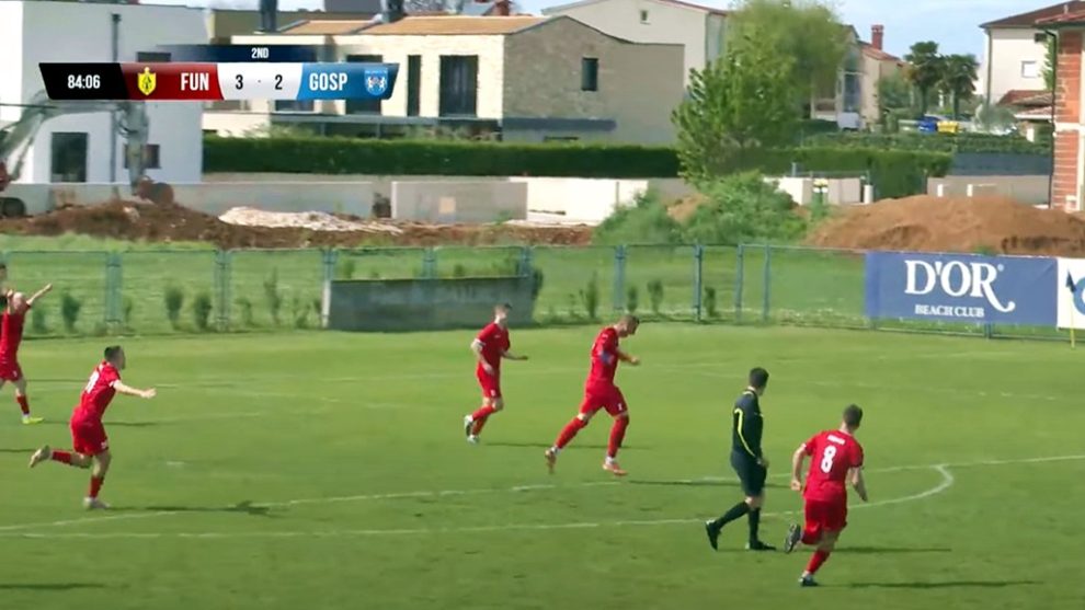 U 40. minuti Gospić 91 ima korner, Funtana je krenula u kontru, Vladišković dao u for za Kodrnju ispred kojeg stoper gostiju pada ničim izazvan, a mladi veznjak „gura“ loptu na drugu stranu gdje ju je Abel Peteh pretvorio u 2:1!