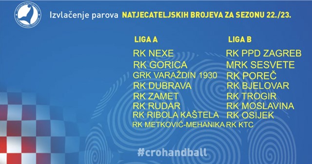U Trofejnoj sobi Hrvatskog rukometnog saveza uz izravni prijenos na YouTube kanalu HRS – a, određeni su sastavi klubova: Lige A i Lige B Paket24 Premijer lige, ali i startni brojevi svih ostalih liga kojima će se uz pomoć Bergerovih tablica definirati parovi i raspored igranja u natjecateljskoj sezoni 2022./23.