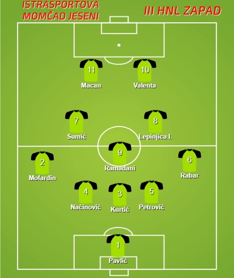 Vezna linija je sljedeća – prava „šestica“, zadnji vezni je Hisa Ramadani koji to igra u pulskom Uljaniku vrlo dobro, a ispred njega su Porečani, malo formacijski „dislociran“ Oliver Sumić, jedan od najboljih u ligi i strijelac čak šest golova za Jadran te Igor Lepinjica koji je s pozicije veznjaka ove polusezone zabio pet golova.