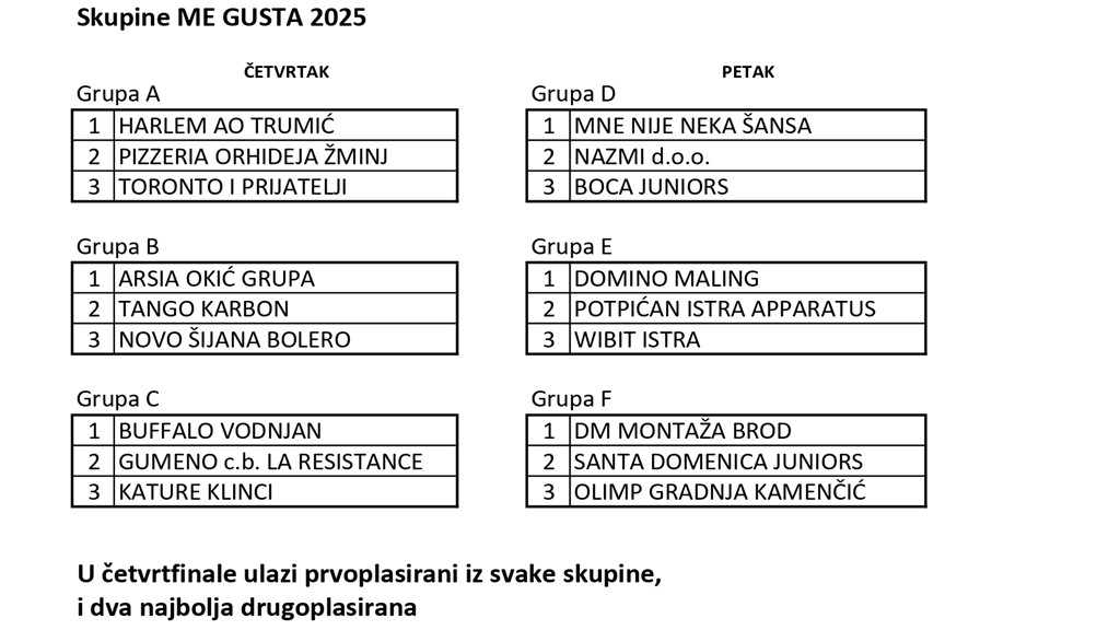 Sinoć su, nakon utakmica kategorija U13, izvučene skupine seniorskog turnira Me Gusta u Labinu! Već sad možemo reći da ima nekoliko izjednačenih skupina i zanimljivo će biti vidjeti koje ekipe će izboriti nedjeljnu završnicu.