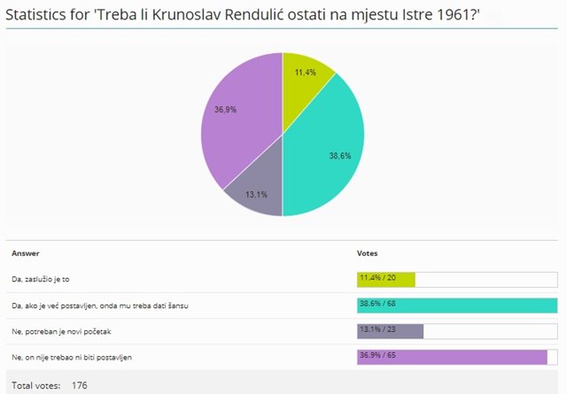 U našoj 12-osatnoj anketi u vezi ostanka trenera Istre 1961 Krunoslava Rendulića sudjelovalo je 176 ispitanika. Mišljenje javnosti je otprilike onakvo kakvo se činilo i na forumima diljem države – polovično.