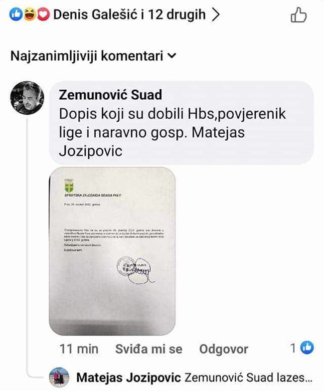 Odgođeni susret boćarske Superlige dobio je novi epilog. Naime, iako nikad nije stiglo službeno obrazloženje zašto je sporni susret odgođen, predsjednik Boćarskog kluba Pula Suad Zemunović objavio je (pa izbrisao, što je također znakovito) na društvenim mrežama dokument koji baca novo svjetlo na cijelu priču.