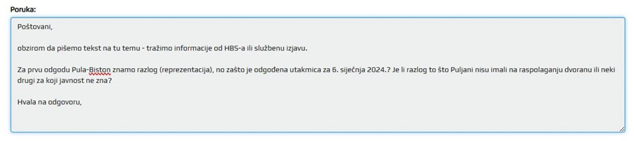 Povjerenik je utakmicu odgodio na zahtjev domaćina, i to zbog obavijesti kluba iz Pule kako vlasnik objekta u kojima odigrava svoje susrete ne dozvoljava korištenje dvorane na praznik, odnosno 6. siječnja.