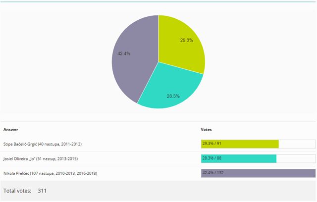 Realno, neke velike dvojbe nije ni bilo. Nikola Prelčec imao je daleko najviše nastupa te je dobio 132 glasa, odnosno 42.4%. Slijedi Stipe Bačelić Grgić s 91 glasom (29.3%), a tri manje dobio je Josiel Oliveira „Jo“ (28.3%).
