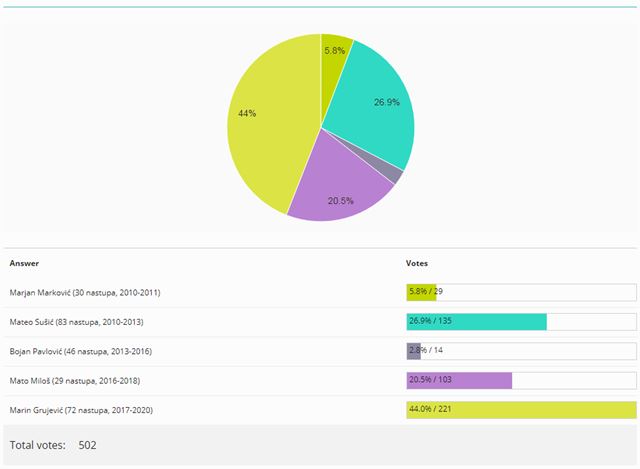 Nakon njega Mateo Sušić je stigao do 26.9%, odnosno 135 glasova, 32 više od Mate Miloša koji je stigao do 20,5%. Marjan Marković dobio je 29 glasova (5,8%), a Bojan Pavlović 14 (2,8%). Hvala na sudjelovanju u anketi!