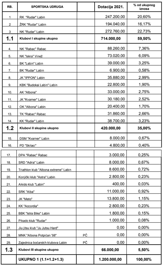 - Kao sastavni dio Financijskog plana Sportske zajednice Grada Labina za 2021. godinu, usvojena je raspodjela sredstava za udruge članice.
