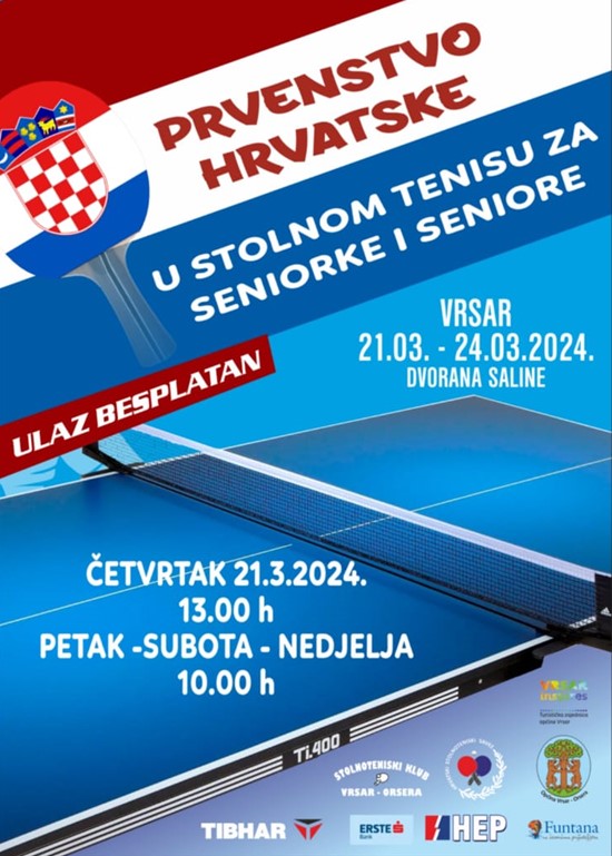 Od 21. do 24. ožujka u Vrsaru se održava Prvenstvo Hrvatske u stolnom tenisu za seniorke i seniore. Dvorana Saline i ovog puta će okupiti najbolje stolnotenisač(ic)e u državi.