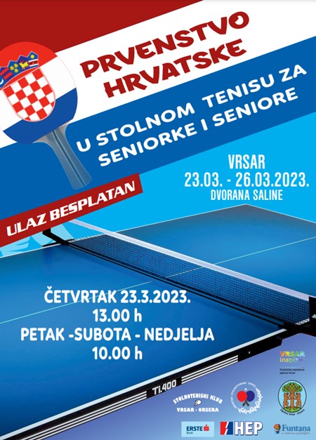 Vrsar će ponovno biti centar svih stolnoteniskih zbivanja u Hrvatskoj. Naime, od četvrtka 23. ožujka do nedjelje 26. ožujka 2023. sve najbolje seniorke i seniori su u Vrsaru, dvorana Saline na prvenstvu Hrvatske.